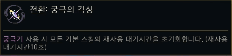 | 궁극기 각성 (Ultimate Awakening) | 궁극기 사용 시 모든 기본 스킬 쿨타임 초기화 (쿨 10초). | 쿨감, 궁극기 연계 |
