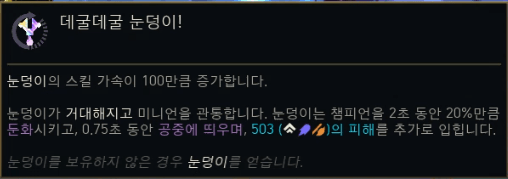 | 눈덩이 룰렛 (Snowball Roulette) | 표식 돌진 후 자신에게 무작위 이로운, 대상에게 무작위 해로운 소환사 주문 시전. | 표식 강화, 무작위 |