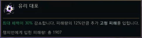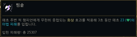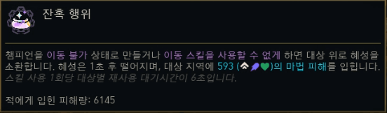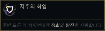 | 고문관 (Tormentor) | CC 부여 시 5초간 화상 (초당 최대 체력 0.8% 마법 피해), 무한 중첩. | 지속 피해, CC, 화상 |