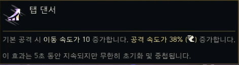 | 탭 댄서 (Tap Dancer) | 기본 공격 시 이속 +10 (무한 중첩). 이속 1%당 공속 1% 증가. | 이동 속도, 공격 속도 |