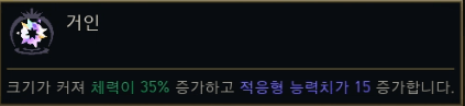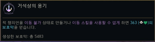 | 거대한 용기 (Courage of the Colossus) | 이동 불가/속박 효과 부여 시 3초간 보호막 (100~300 + 최대 체력 5%). (쿨 5초) | 방어, 보호막, CC |