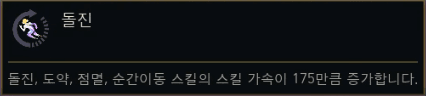 | 질주 (Dashing) | 돌진/순간 이동 스킬에 스킬 가속 175 부여. | 이동, 쿨감 |