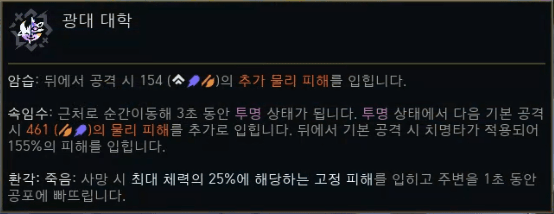 | 무자비한 자 (The Brutalizer) | 추가 AD +25, 스킬 가속 +10, 방관 +5. | AD 능력치 |