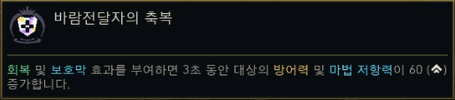 | 수호자의 장막 (Veil of Warding) | 주문 보호막 획득 (쿨 15초). | 주문 보호막, 방어 |
