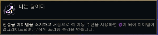 | 나에게 왕을 (King Me) | 적 포탈/투석기 첫 사용 시 무작위 프리즘(S) 증강, 첫 전설템 오른 걸작 업그레이드. | 아이템, 보상, 무작위 |