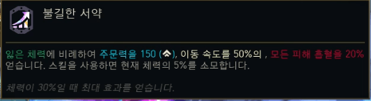 | 불길한 계약 (Ominous Pact) | 스킬 사용 시 현재 체력 5% 소모. 대신 주문력/이속/모든 피해 흡혈 증가. | 체력 소모, 흡혈, 능력치 |