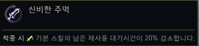 | 에테르 무기 (Ethereal Weapon) | 스킬 공격이 적중 시 효과 100% 적용 (대상당 1초 쿨). | 적중 시 효과, 스킬 공격 |