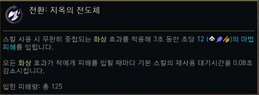 | 지옥불 전도 (Infernal Conduit) | 스킬 적중 시 5초간 화상. 화상 피해마다 기본 스킬 쿨 0.08초 감소. | 지속 피해, 쿨감 |