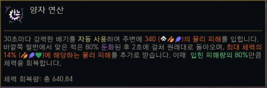| AP/AD 전환 (EscAPADe) | AP를 AD로 전환. 총 공격력 +15%. | 능력치 전환, AD |