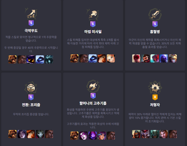 이런 증강들은 절대적으로 나쁜 것은 아닙니다. 다만, S/A 티어와 비교했을 때 게임 영향력이 떨어진다는 의미일 뿐이에요. 예를 들어 극악무도는 마나가 부족한 마법사 챔피언에게 유용할 수 있습니다!