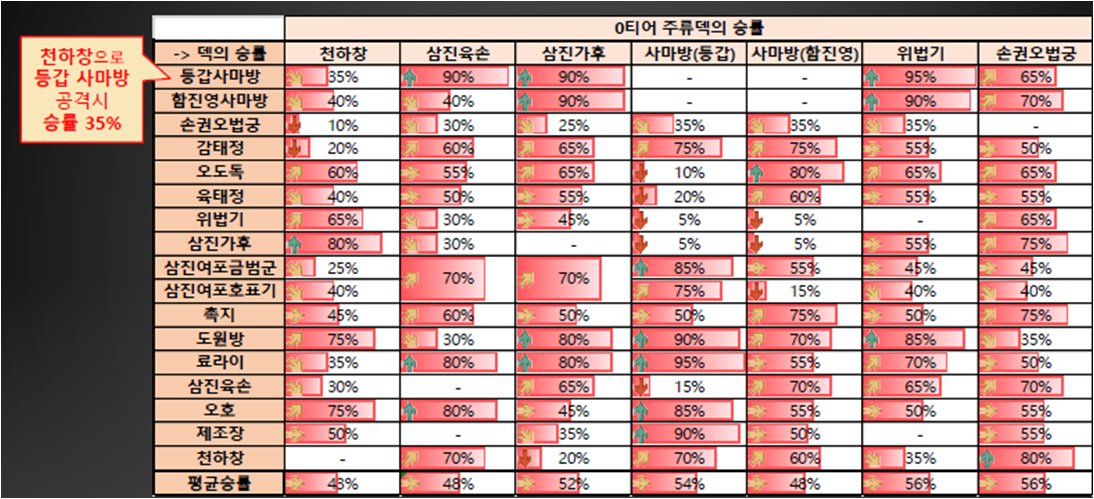 먼저 삼국지 전략판 시즌3 상성표입니다. 상성표에 써있는 것 처럼 열부터 보고 행을 보시면 승률이 나옵니다. 중국 출처로 꽤 정확한 데이터입니다😀 (ex. 천하창으로 등갑사마방 공격 시 35% 승률)