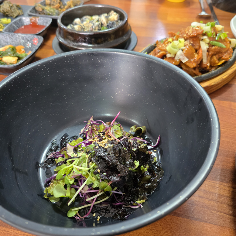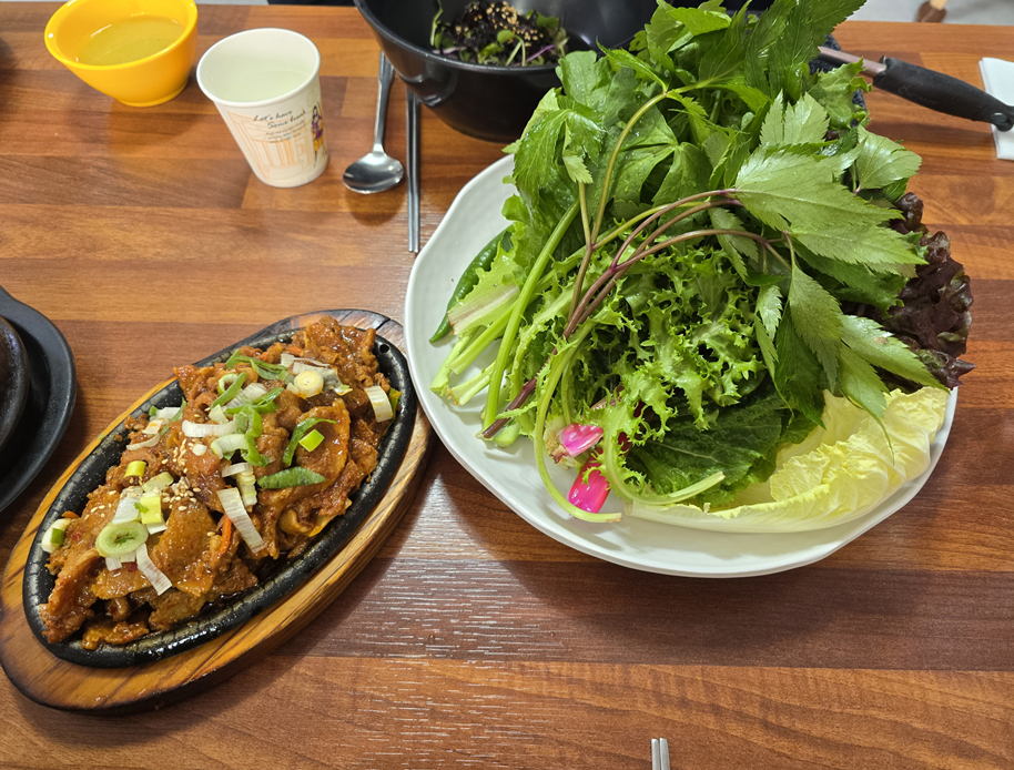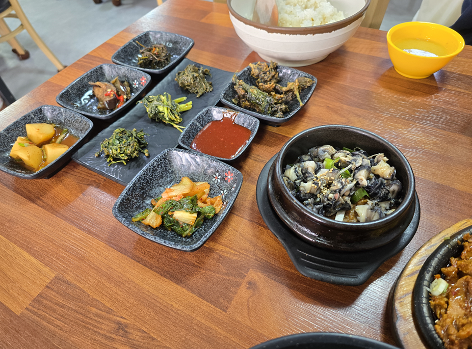 여기 다양한 나물 반찬들과 싱싱한 우렁강된장, 쌈채소, 제육볶음, 우렁무침(못찍었어요😥)이 보이시나요~?