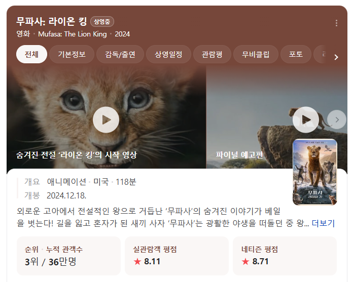여러 평이 갈리긴 하지만 무파사 라이온킹은 제게 동심 찾게 해준 재밌는 영화였답니다.