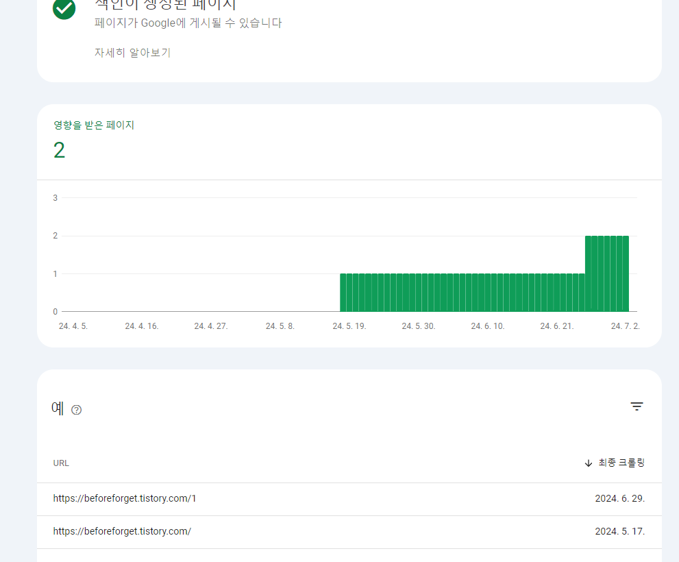 현재 https://beforeforget.tistory.com/1~7에 대한 페이지 색인 요청을 해놓았으니 며칠 뒤에 다시 한번 결과를 확인해보겠습니다.