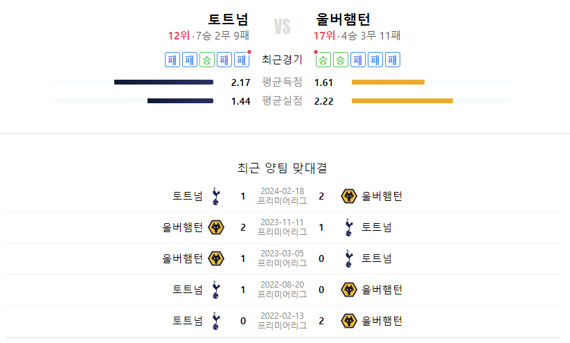 울버햄튼은 토트넘과의 상대 전적에서 우위를 보이고 있습니다. 지난 시즌 두 경기 모두 2-1로 승리했으며, 최근 6차례 토트넘 원정에서 4승을 거두는 등 강한 모습을 보여왔습니다.