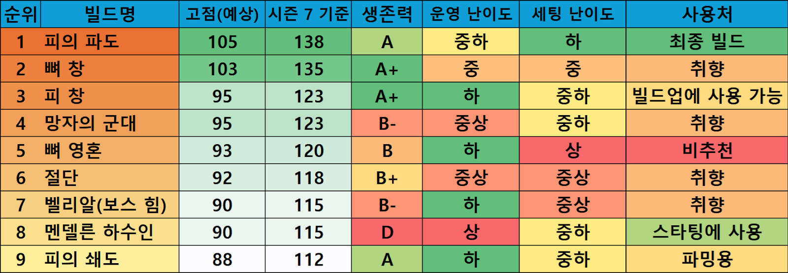 | 피의 쇄도 | A (파밍용) | 빠른 성장, 파밍에 최적 |