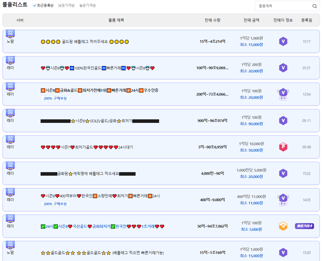 - 아이템매니아 : 유저는 많은데 업자 거래글이 너무 많아서 찾기가 어려움, 현금화 가능